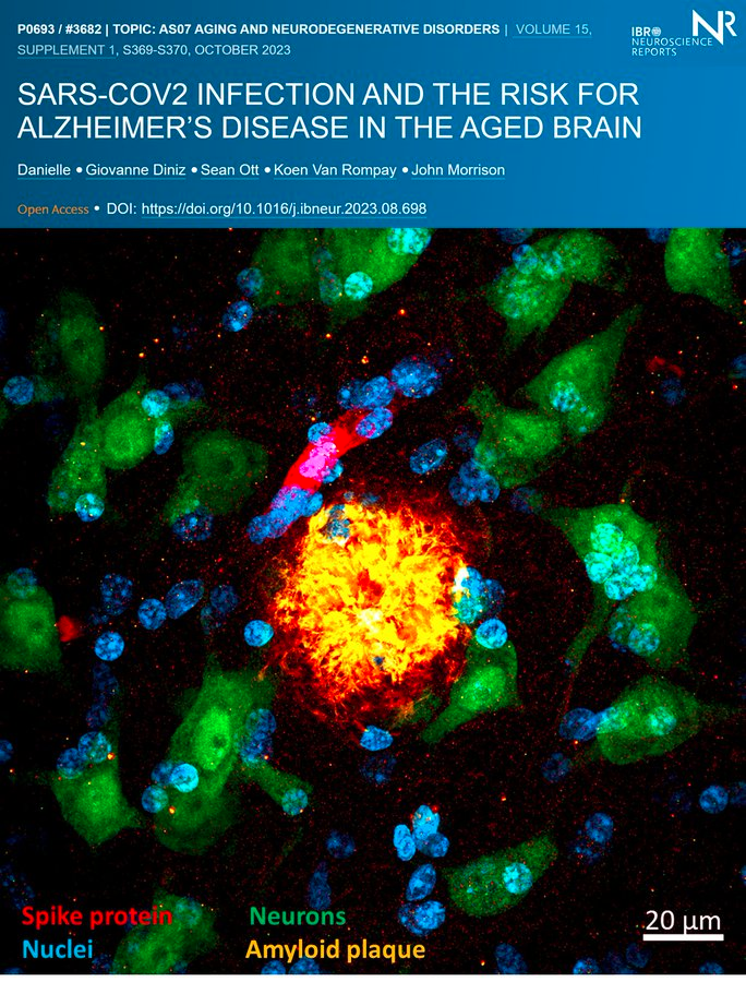 大多数灵长类动物会自然形成老年斑(β-淀粉样蛋白沉积物),这是一种已知在正常衰老和阿尔茨海默病中积聚在大脑中的错误折叠蛋白质之一。由于猴子也可以捕捉 #SARSCoV2 并出现与人类相似的症状,因此我们开始研究老年猴子被感染后大脑中会发生什么。