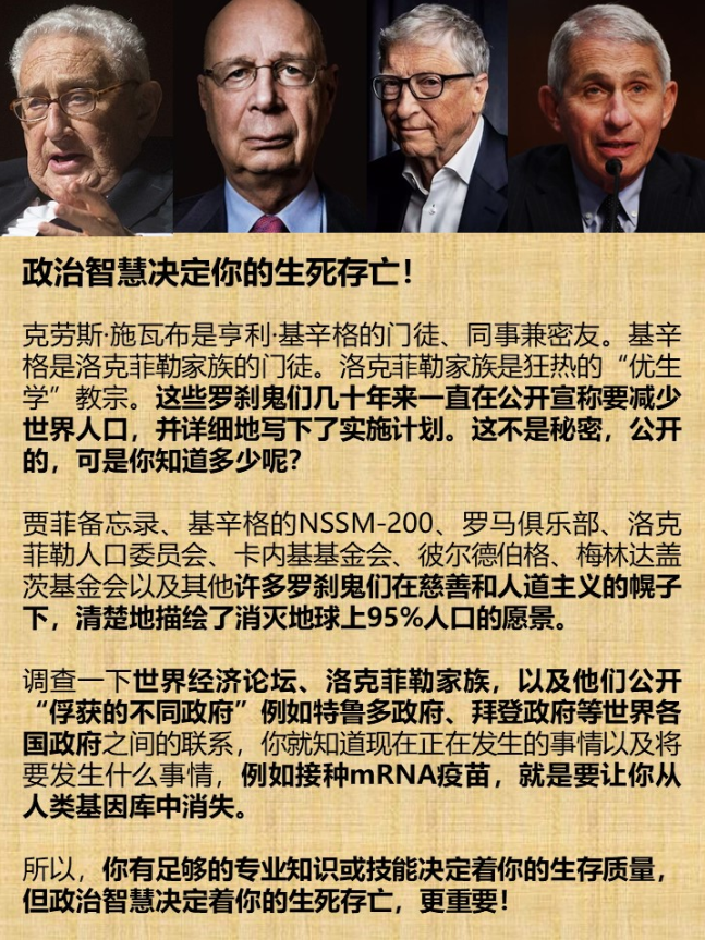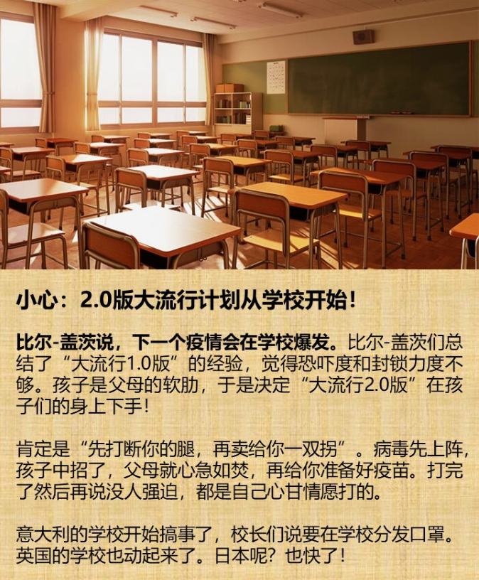 小心:2.0版大流行计划从学校开始! 比尔-盖茨说,下一个疫情会在学校爆发。比尔-盖茨们总结了“大流行1.0版”的经验,觉得恐吓度和封锁力度不够。孩子是父母的软肋,于是决定“大流行2.0版”在孩子们的身上下手!肯定是“先打断你的腿,再卖给你一双拐”。病毒先上阵,孩子中招了,父母就心急如焚,再给你准备好疫苗。